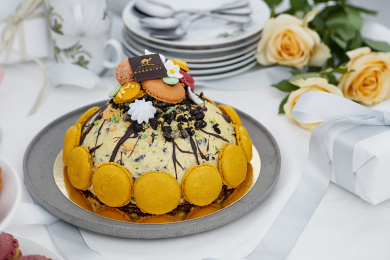 Vår originale Dromedarbakeriet Marsipankake, fås også som lukket valnøtt. Den er nybakt samme dag med fløyelsmyk krem på luftig sukkerbunn med vaniljekrem, sjokoladebiter og nyrørte bringebær, trukket med marsipanlokk og pyntet med håndlagde makroner, marsipan og sjokolade fra vårt håndbakeri. Denne fås med bilde og farget marsipanfarge mot et tillegg. Gluten– og laktoseintoleranse har vi også god erfaring med. Se flere kaker i nettbutikken vår.