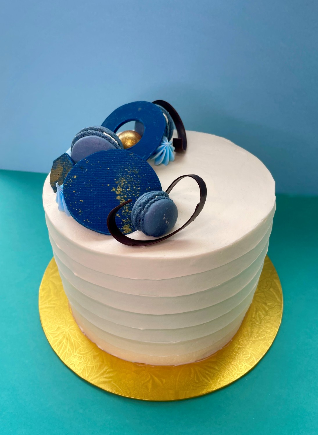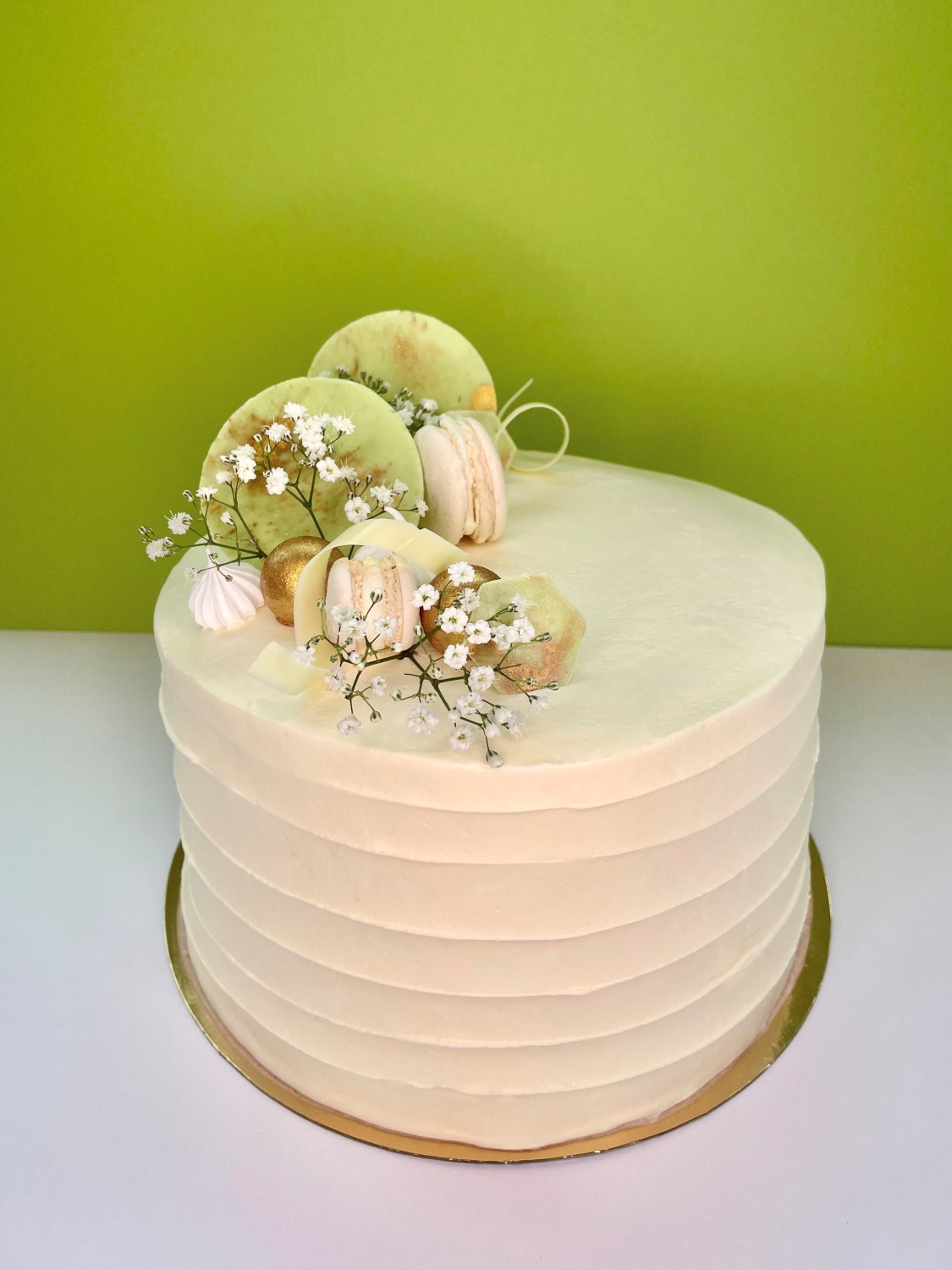Kaken er pyntet med håndlaget pynt som marengs, makroner og sjokolade.